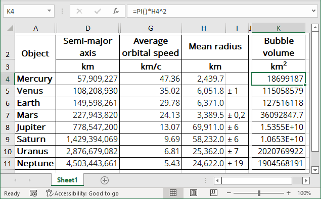 - Column K contains the formula to calculate the circle area using the average planet radius: