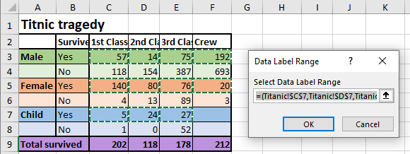 - In the Data Labels Range dialog box, select the appropriate data range: