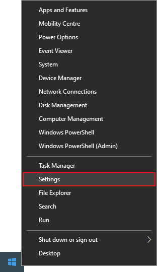 - Right-click the Start icon in the lower left side of the desktop screen, and then select Settings: