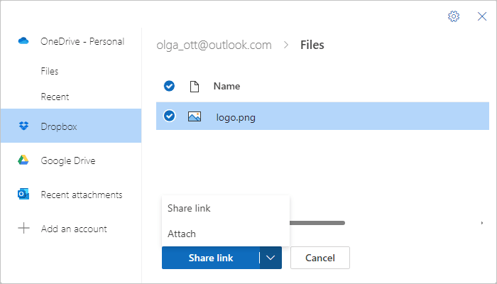 Note: If you use Google Drive or DropBox, select Add an account to connect to the service to your Outlook.com account. These accounts must be added before you can attach files stored in these cloud locations: