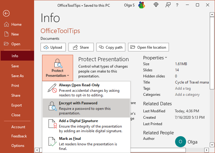 B.1. On the File tab, select the Info pane, then click the Protect Presentation button and choose Encrypt with Password: