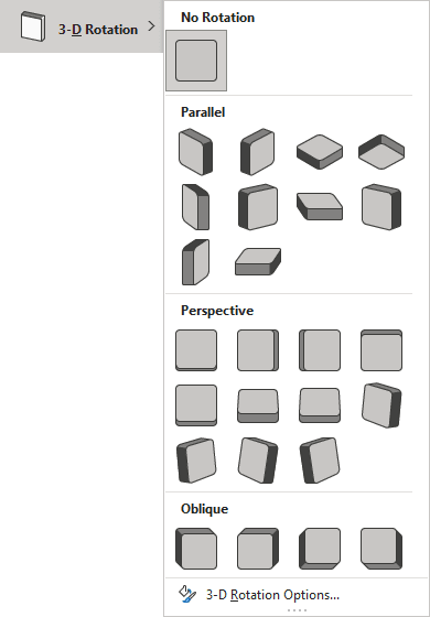 - On the Picture Format tab, in the Picture Styles group, click the Picture Effects dropdown list, then select the 3-D Rotation list: