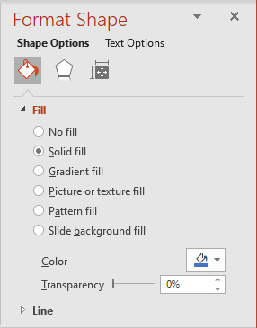 5.3. On the Format Shape pane, on the Shape Options tab, in the Fill & Line group, in the Fill section, choose Solid fill and then select Color as you prefer: