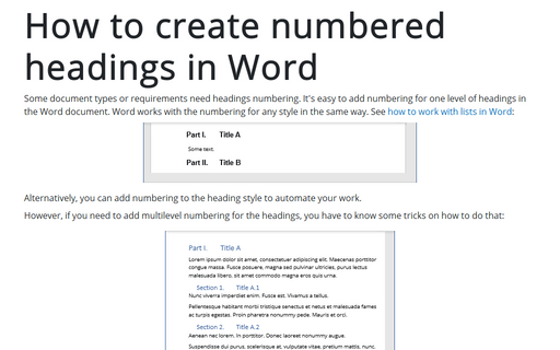 Some document types or requirements need headings numbering. It's easy to add numbering for one level of headings in the Word document. Word works with the numbering for any style in the same way. See how to work with lists in Word:
