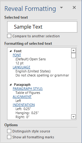 2. Turn on the Reveal Formatting pane to see all styles in a document by clicking Shift+F1: